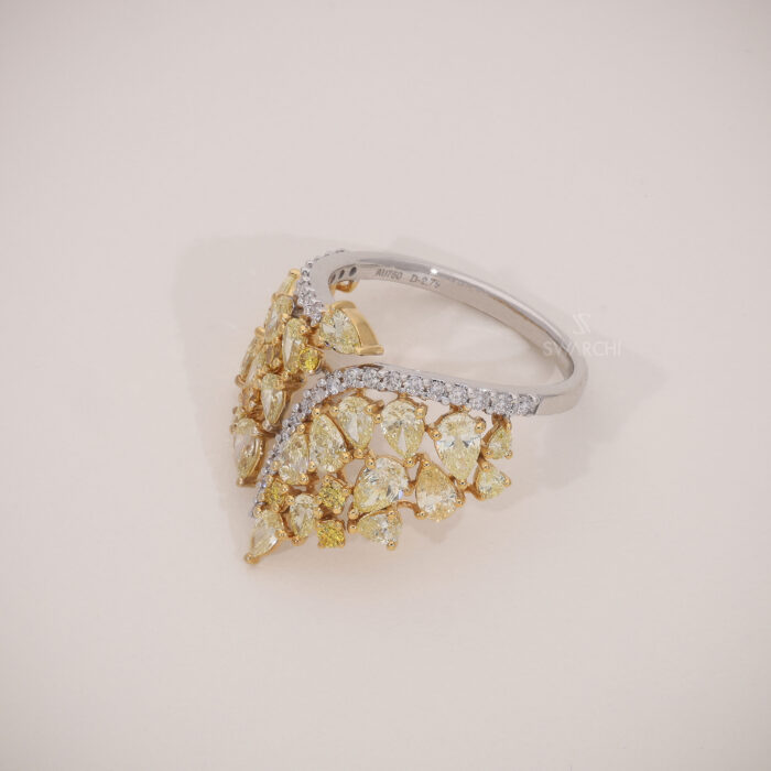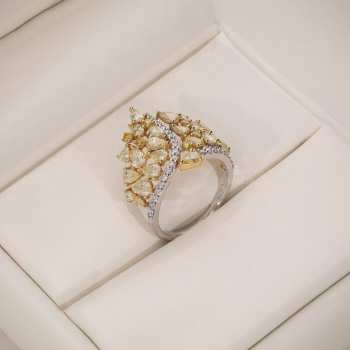 A majestic 18KT White & Yellow Gold statement ring featuring a dramatic Asymmetrical Wing Design adorned with a mosaic of Pear-Shaped Fancy Yellow Diamonds and shimmering Light pink Diamond Accents.
