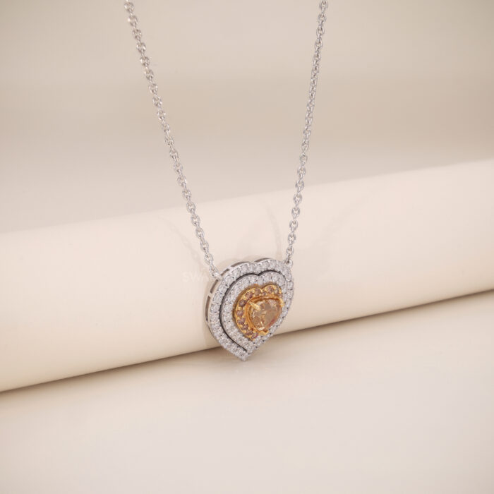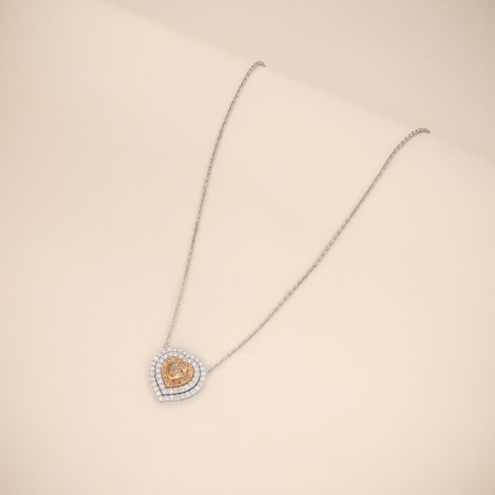 The center diamond is beautifully secured in a refined prong setting, allowing light to illuminate its soft golden tones. Surrounding it, a double-layer heart-shaped halo of brilliant Natural Light Pink And Yellow Diamonds enhances depth, sparkle, and contrast, creating a breathtaking play of light.