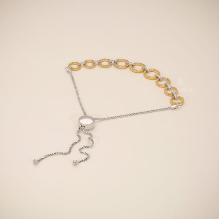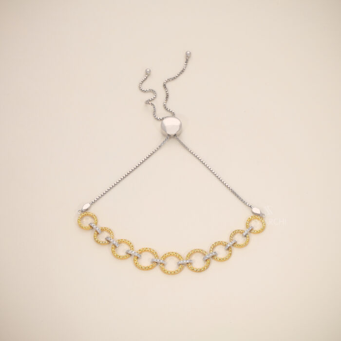 The bracelet is completed with a sleek adjustable slider mechanism, allowing the piece to fit comfortably on different wrist sizes while maintaining a clean and contemporary look. The smooth chain finish and balanced design ensure both elegance and everyday wearability.