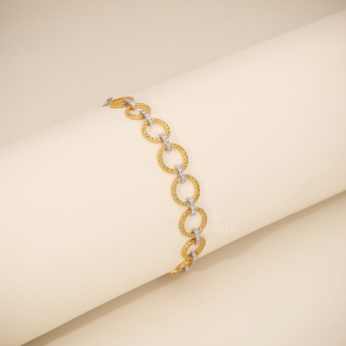 Each circular element is delicately pavé-set with Fancy Yellow Diamonds, creating a warm golden sparkle, while the connecting links are adorned with Natural White Diamonds that add contrast and refined brilliance. This harmonious combination of white and yellow diamonds enhances the visual depth and luxurious appeal of the bracelet.