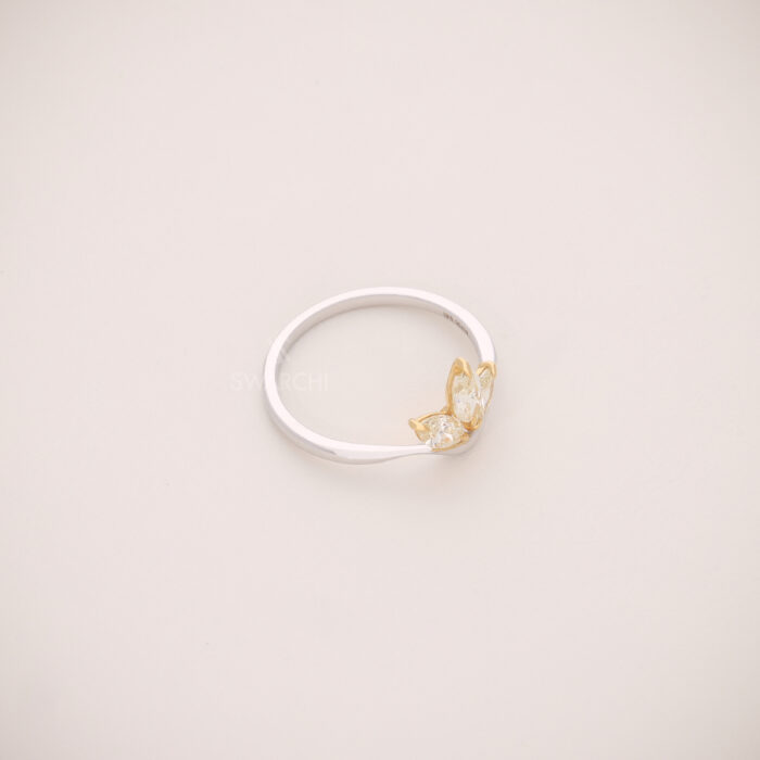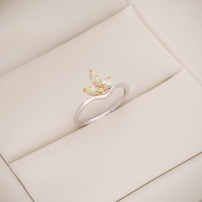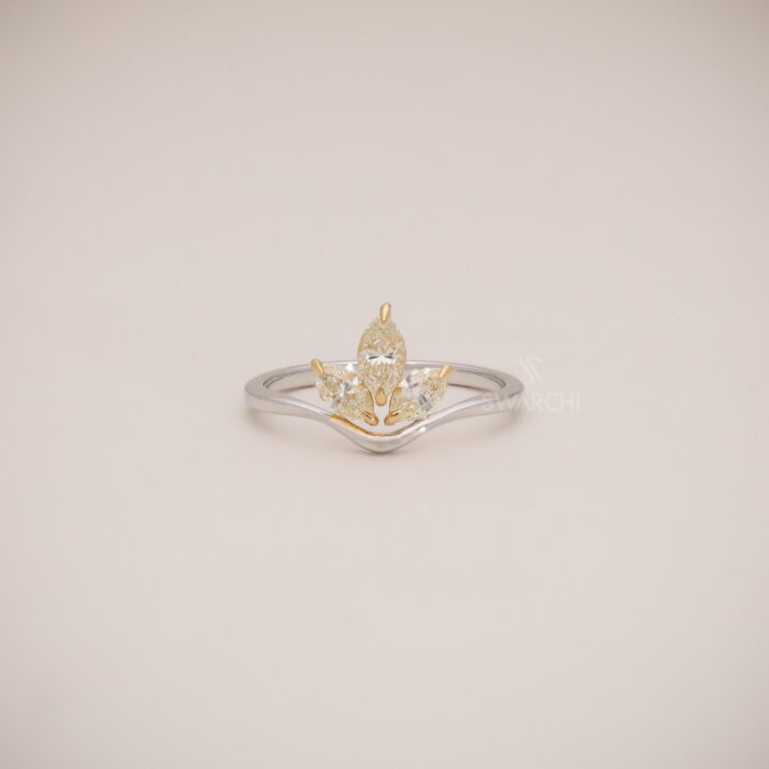 The Aurélia Petal Crest Ring is a delicate celebration of nature-inspired luxury and contemporary craftsmanship. Designed in polished 18KT Dual-Tone Gold, this ring showcases a stunning trio of Natural Fancy Light Yellow Marquise-Shaped Diamonds, arranged to resemble blooming petals forming a graceful crest.