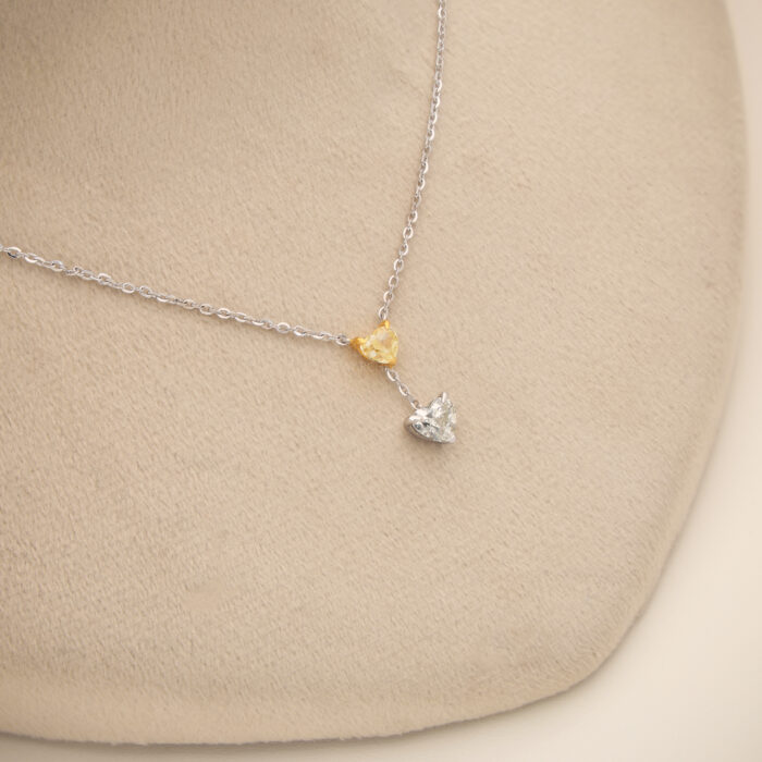 A graceful dual-heart pendant featuring a warm golden heart paired with a sparkling white heart, symbolizing love, balance, and eternal connection.
