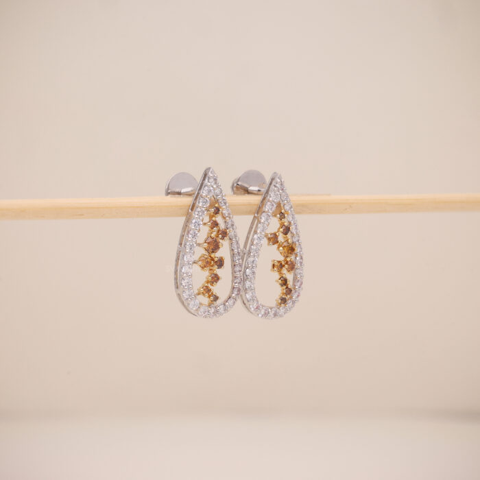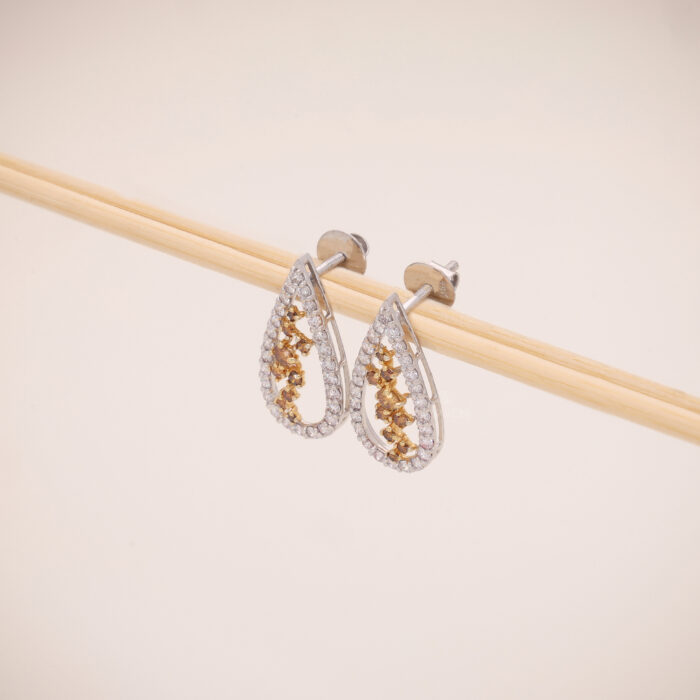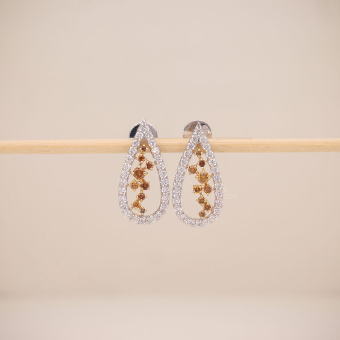 A sophisticated pair of 18KT White Gold diamond drop earrings featuring an elegant pear-shaped silhouette, accented with shimmering light pink diamonds and warm champagne-hued diamonds, symbolizing refined luxury and timeless beauty.