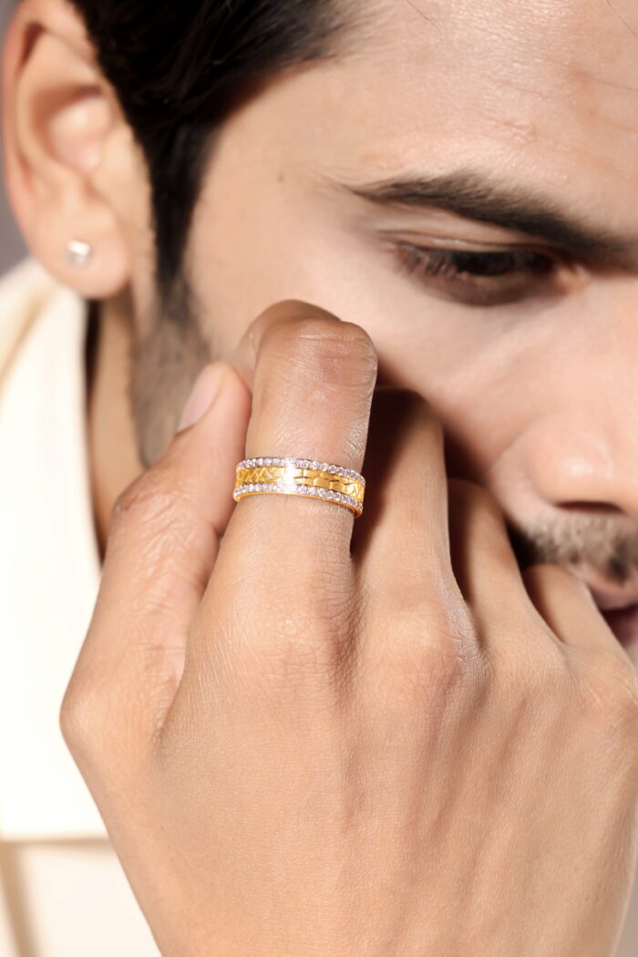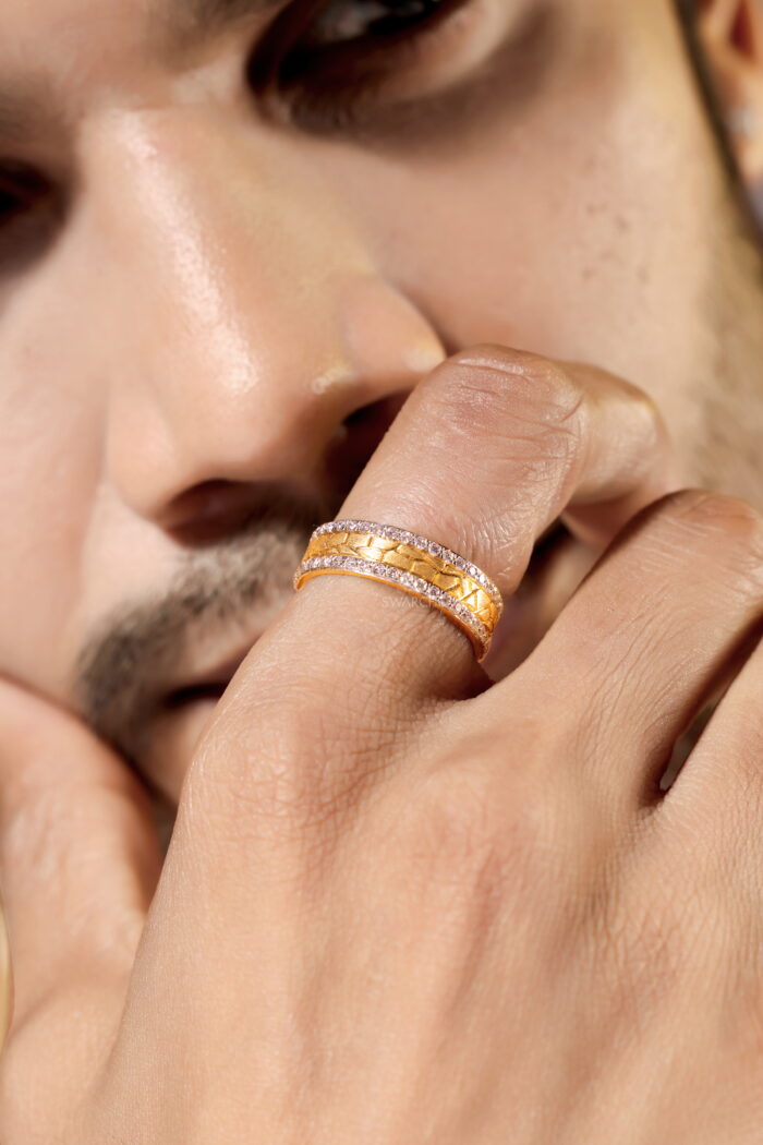 The contrasting textures between the hand-engraved gold and the pristine, shimmering diamonds create a dynamic interplay of light and depth, symbolizing the balance of tradition and modernity. Its full-circle diamond setting ensures that no angle is left unnoticed, making it an ideal statement piece for those who command attention and admiration.