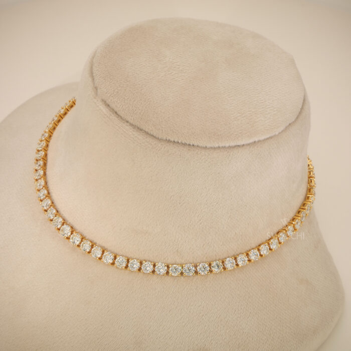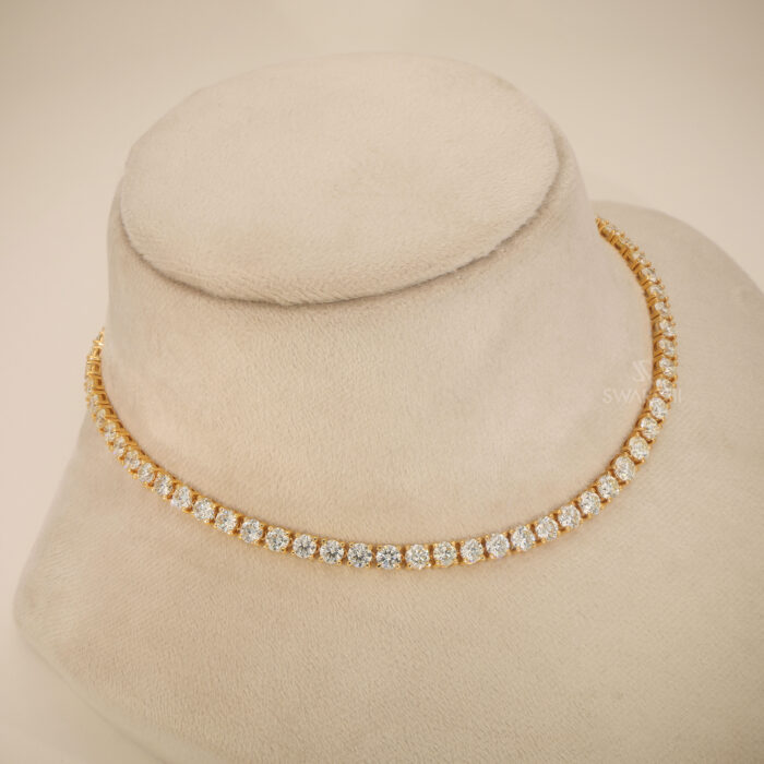 The sleek and balanced tennis-style design allows the diamonds to flow gracefully along the neckline, creating a continuous line of sparkle and sophistication. The warm glow of yellow gold enhances the brilliance of the diamonds, giving the necklace a rich and luxurious appearance.