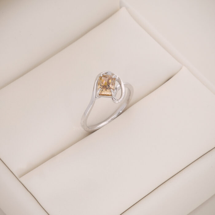 The center diamond is secured in a clean PRONG SETTING, while the graceful CURVED GOLD FRAME wraps around the stone, creating a sense of MOVEMENT AND FLOW. The sculptural silhouette enhances brilliance from every angle, making this ring a perfect choice for those who appreciate CONTEMPORARY LUXURY WITH CHARACTER.