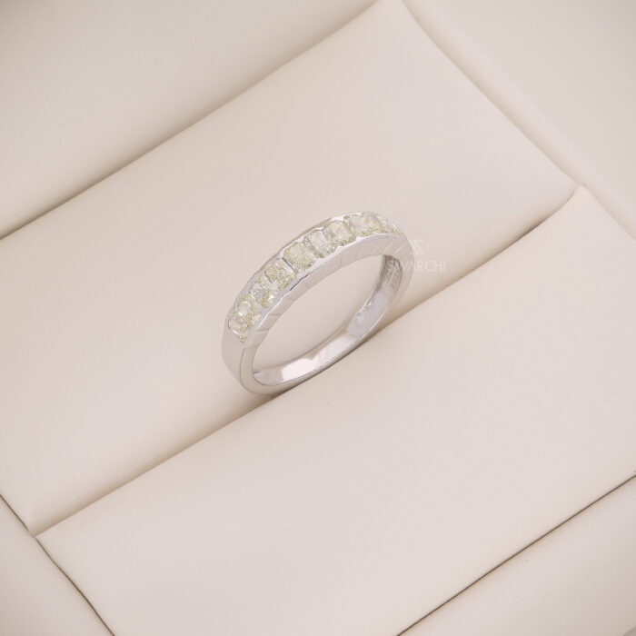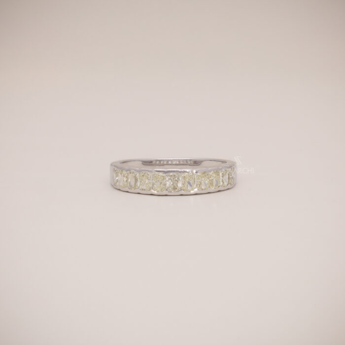 Each diamond is precisely set in a smooth shared-setting style, creating a seamless flow of brilliance across the band. The soft yellow hues beautifully contrast against the polished white gold, enhancing light reflection while maintaining a clean and contemporary aesthetic.