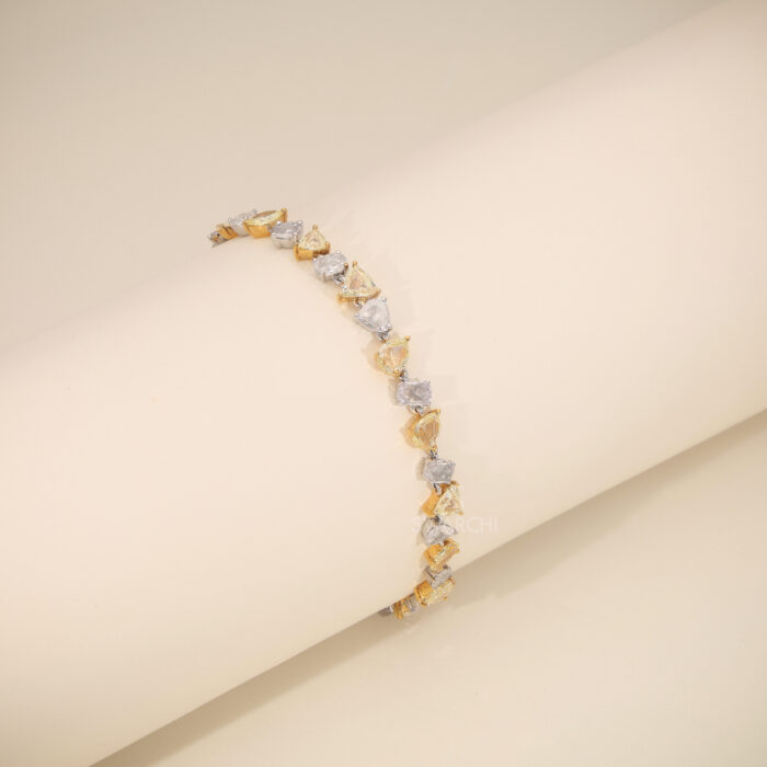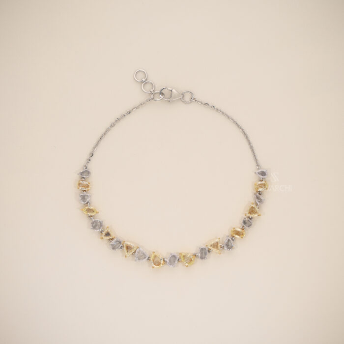 The CÉLÉSTE AURION Bracelet is a refined blend of Artistic Design and European Sophistication. Crafted in luxurious 18KT White And Yellow Gold, this bracelet showcases a graceful sequence of Mixed Diamond Shapes, symbolizing creativity, individuality, and flowing elegance.
