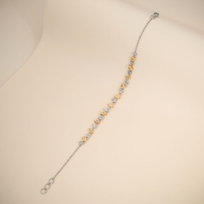 A delicate 18KT White & Yellow Gold bracelet featuring artistic Mixed Shape Motifs adorned with Natural Light pink  Diamonds and Fancy Yellow Diamonds, creating a soft and fluid sparkle.