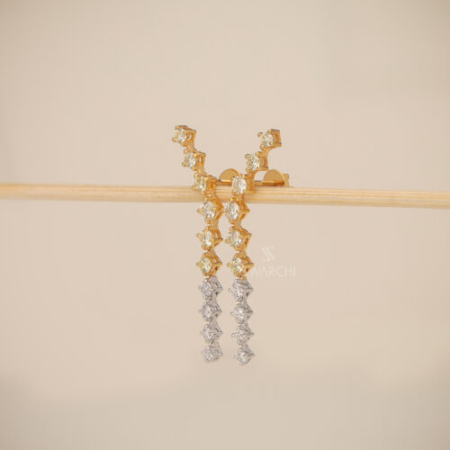 The topmost element is a petite, elongated diamond-studded loop, linked to a single round diamond, which acts as a delicate connector between the elements. The main body of the earrings is composed of two gracefully nested marquise-shaped outlines, encrusted with dazzling white diamonds, while the inner edges are adorned with fancy-colored yellow diamonds, adding warmth and contrast.