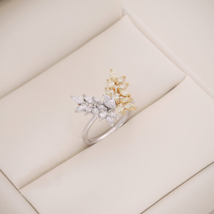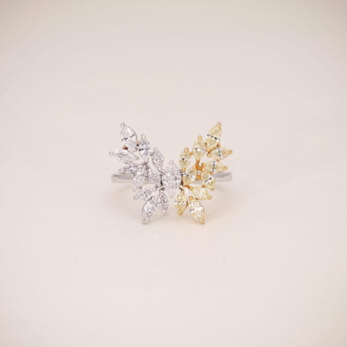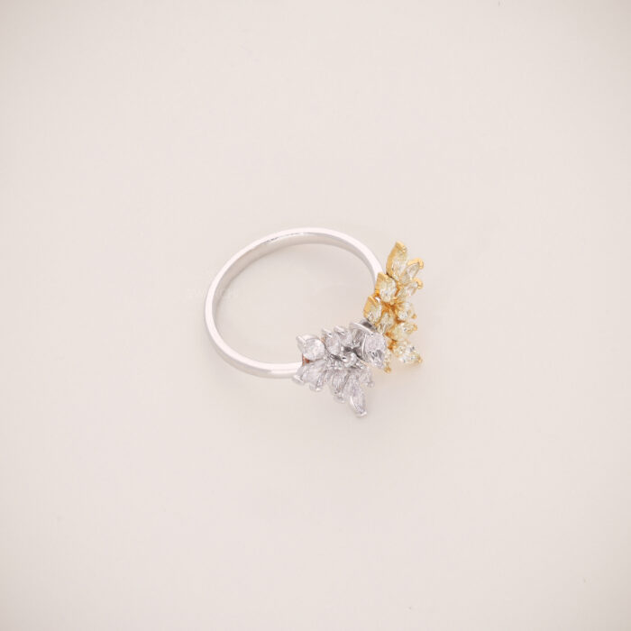 The DuoFlora Éclat Ring is an artistic celebration of contrast and balance, inspired by European high-jewelry craftsmanship. Meticulously crafted in 18KT White & Yellow Gold, this ring showcases two beautifully sculpted floral clusters positioned side by side, symbolizing unity and duality.