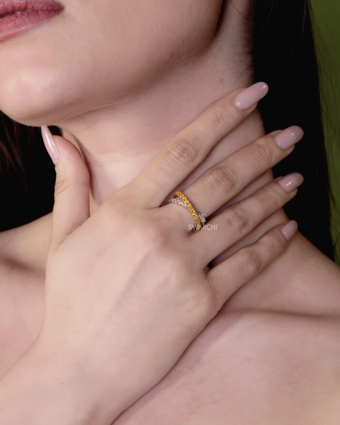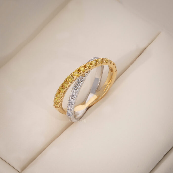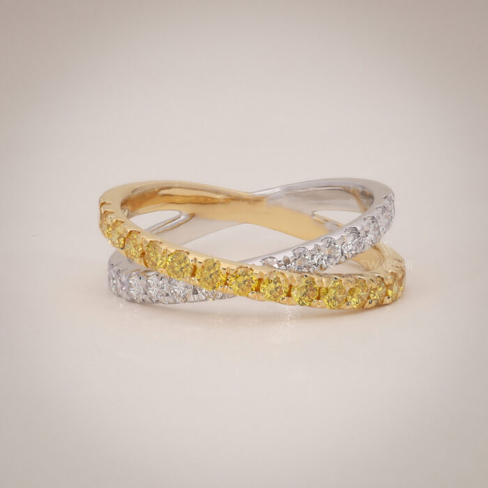 The Eterna Lux Ring is a mesmerizing fusion of 18K gold, set with natural fancy yellow and light pink diamonds. Its elegantly intertwined design symbolizes eternity and unity, making it a timeless expression of sophistication and luxury.