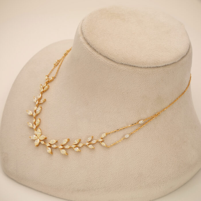 A refined 18KT Yellow Gold necklace adorned with marquise-cut natural diamonds, forming a delicate floral-leaf motif that exudes European grace and understated luxury.