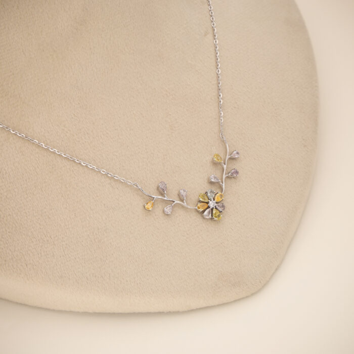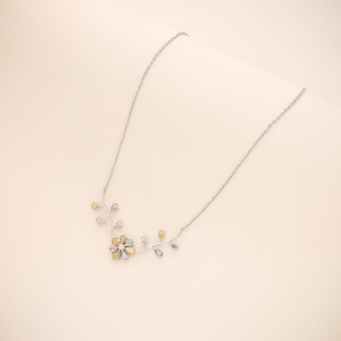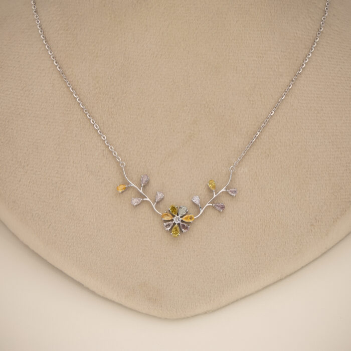 A delicate 18KT White Gold Pendant featuring a floral vine motif adorned with natural fancy color diamonds, creating a refined expression of European elegance and gentle luxury.