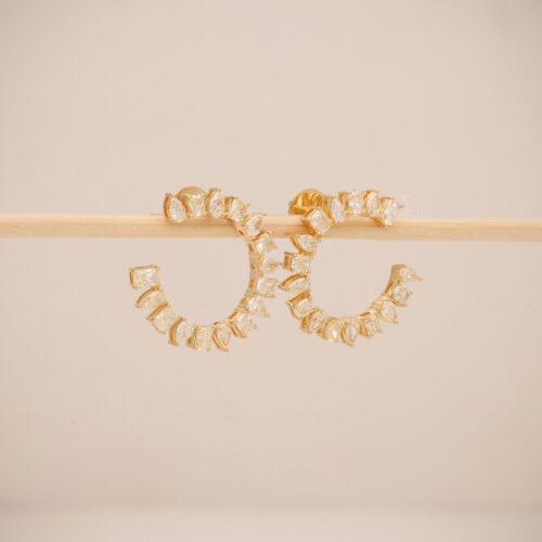 Lueur Feuillée captures the delicate beauty of a golden leaf kissed by light—crafted in 18K gold and adorned with natural fancy yellow and light pink diamonds, these earrings reflect nature’s elegance through soft sparkle and graceful curves.
