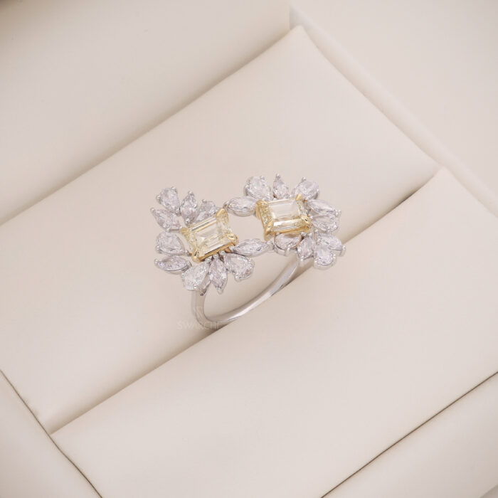 An exquisite 18KT White Gold diamond ring featuring a dual emerald diamond centerpiece, surrounded by a radiant halo of marquise natural diamonds, symbolizing balance, harmony, and modern luxury.