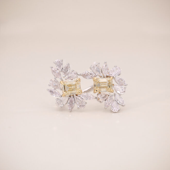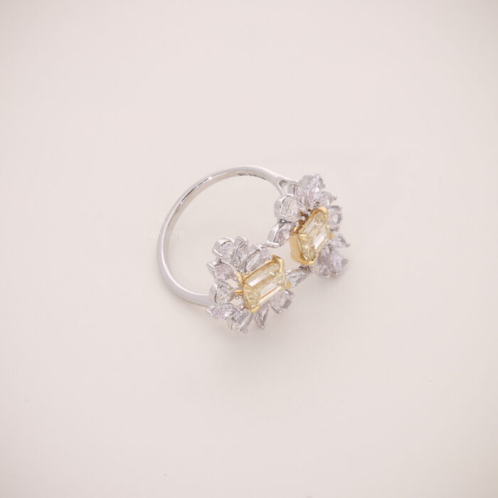 The Lunéa Éclat Duo Diamond Ring is a refined statement of contemporary European fine jewelry design. Crafted in polished 18KT White Gold, the ring presents a graceful dual-stone composition, each showcasing a rectangular emerald natural diamond set in warm 18KT Yellow Gold prongs for a striking contrast.