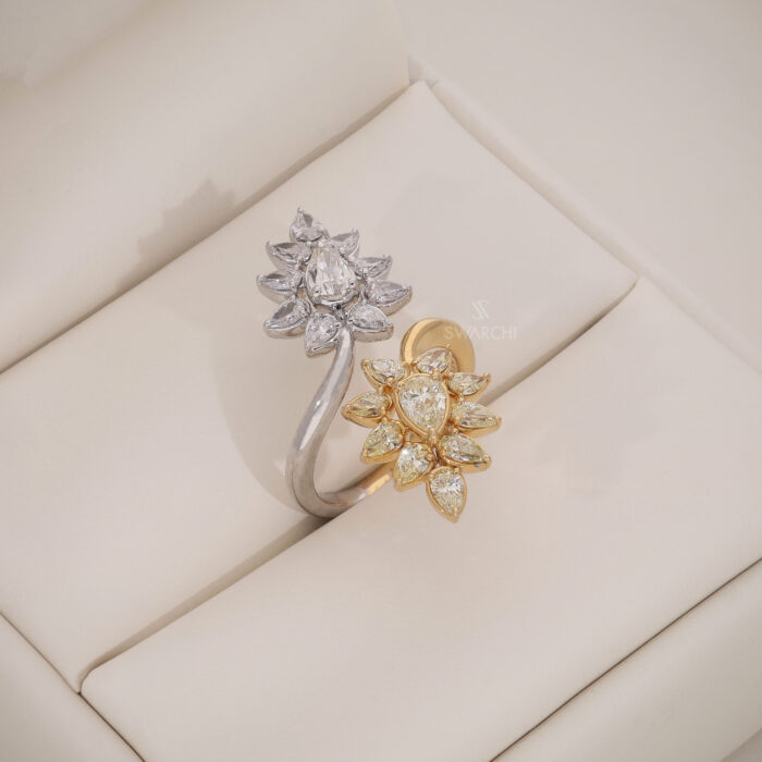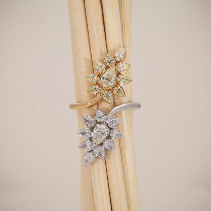 The Pear-Shaped Diamonds are arranged in a fanned-out, petal-like formation, creating a sense of fluid movement and organic grace. The slim, polished bypass band ensures a lightweight feel and a highly Comfortable Wear for any occasion.
