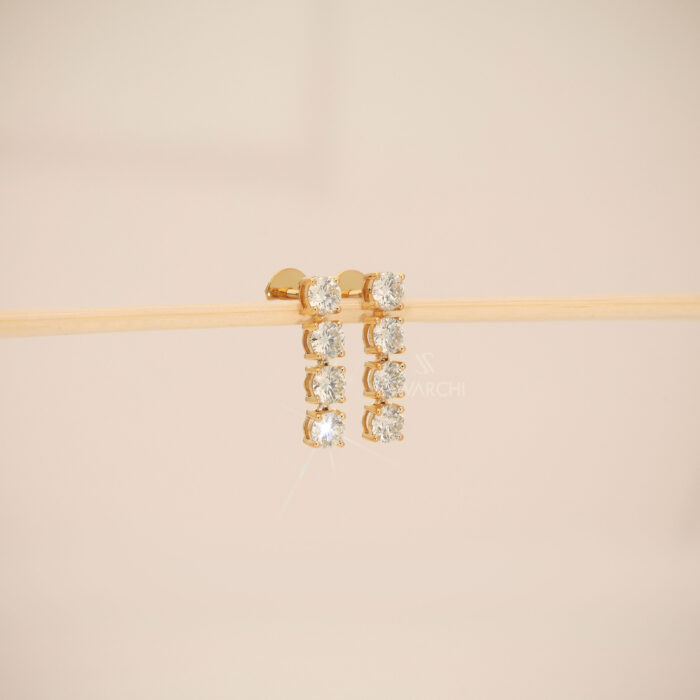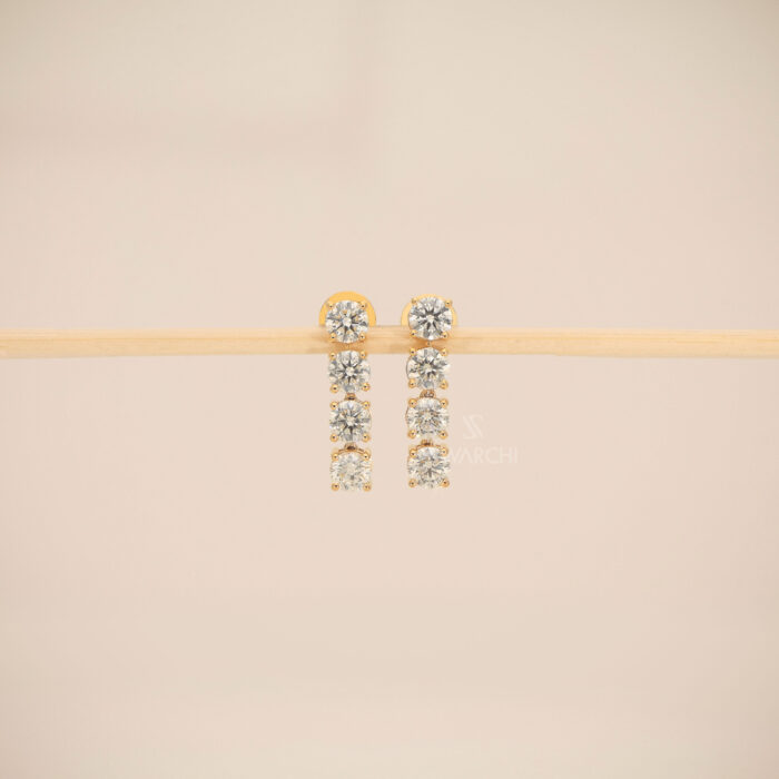 Each earring showcases a perfectly matched strand of four Natural Round Brilliant-Cut Diamonds. The stones are set in a traditional four-prong basket setting, specifically engineered to allow maximum light entry from all sides, resulting in a high-impact sparkle with every movement.