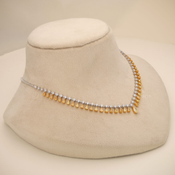 The ORÉLIA RADIANCE Necklace is a beautiful expression of refined luxury and timeless elegance. Crafted in 18KT White & Yellow Gold, the design features a delicate sequence of Natural Fancy Yellow Pear-Shaped Diamonds gracefully suspended along the neckline.
