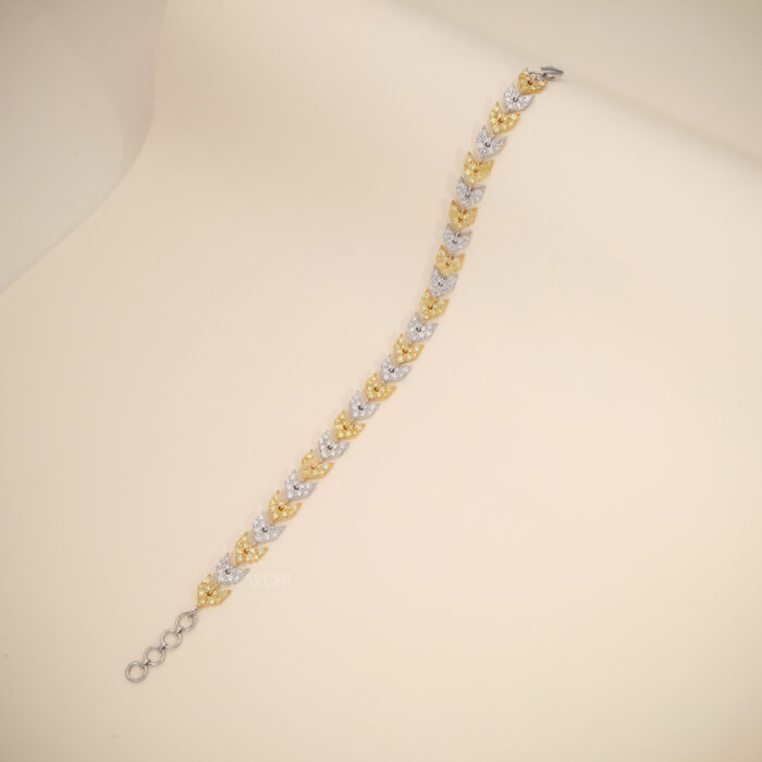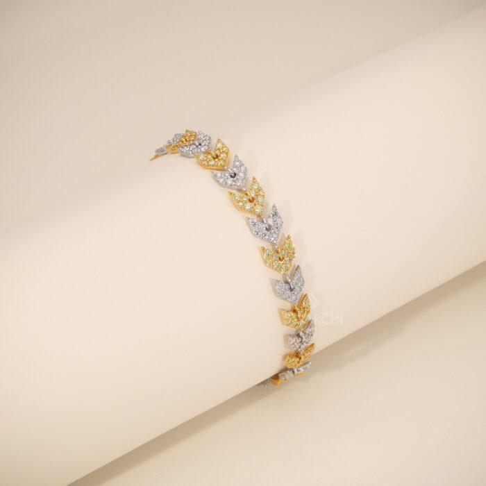 The design features a repeating pattern of interlocking “V” shaped links. Each link is meticulously hand-set with a dense Diamond Pave, alternating between sections of icy white diamonds and warm, sun-kissed Natural Fancy Yellow And Light pink Diamonds. This intentional play of color provides a textured, high-contrast sparkle that remains vibrant from every angle, capturing the light with every movement of the wrist.