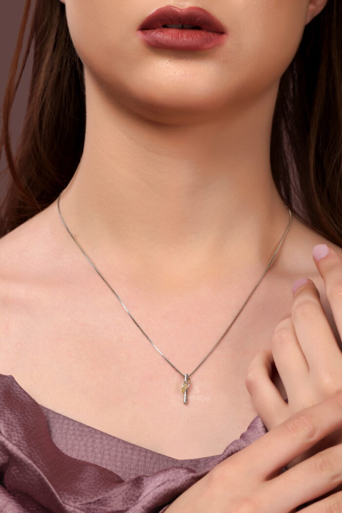 Handcrafted in a sleek blend of Platinum 950 and 18K yellow gold, this necklace and earring set features a sculptural design that is both minimal and emotive. At the center of each piece lies a bold platinum stem—cool, refined, and strong—gently embraced by a curved gold ribbon, symbolizing warmth, motion, and grace.