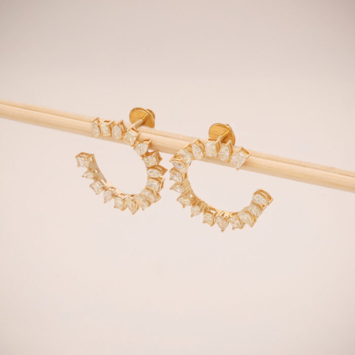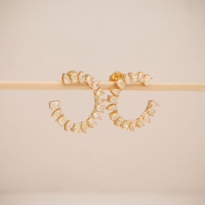 A refined pair of 18KT Yellow Gold crescent hoop earrings featuring a radiant open-circle design, adorned with shimmering Pear and Emerald diamonds, symbolizing modern elegance and timeless beauty.