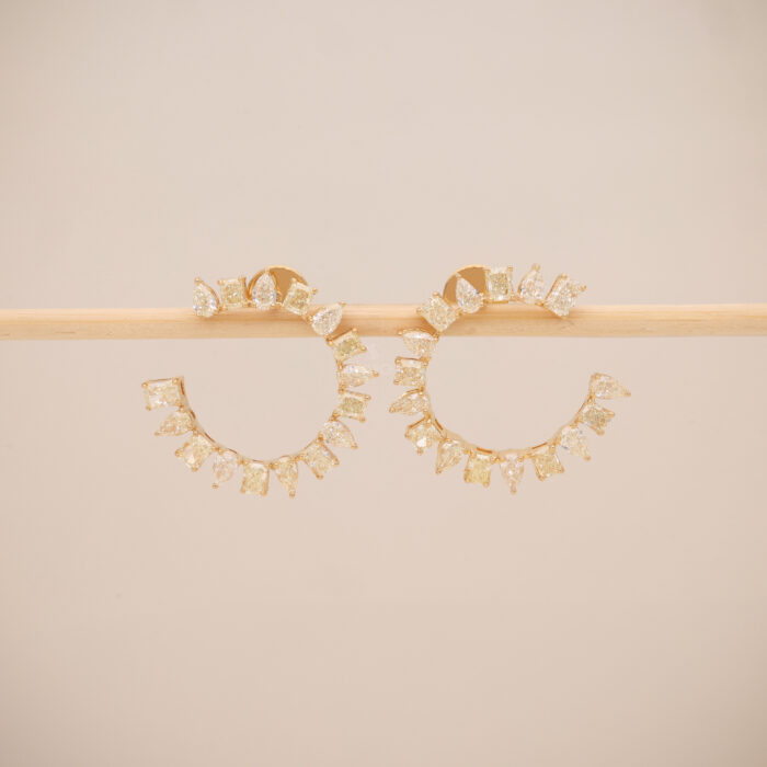 Each crescent is gracefully set with pear and emerald natural diamonds, arranged in a luminous sunburst-inspired pattern that captures and reflects light from every angle. The warm tone of yellow gold enhances the diamonds’ brilliance, creating a refined harmony between contemporary design and classic craftsmanship.