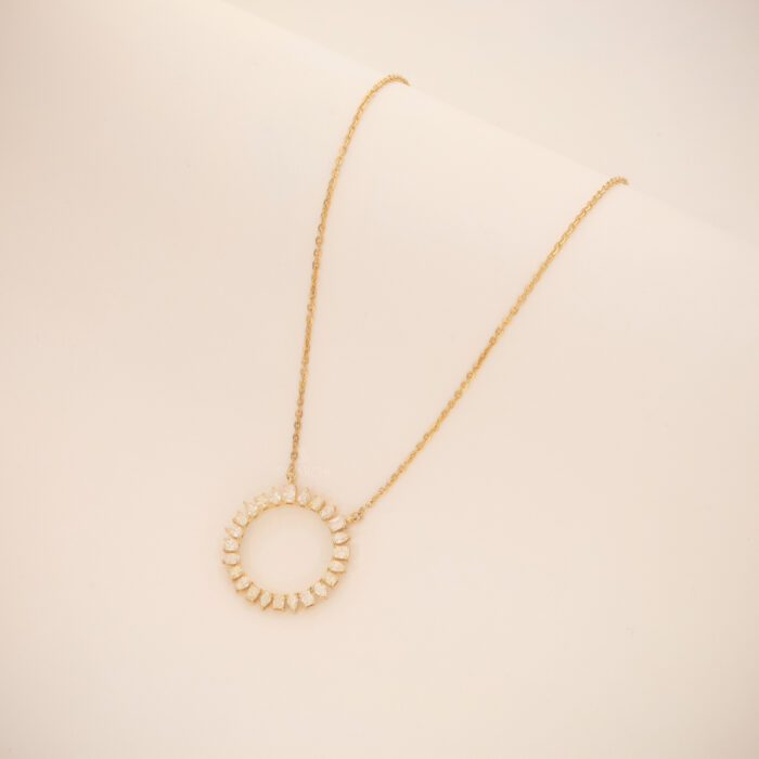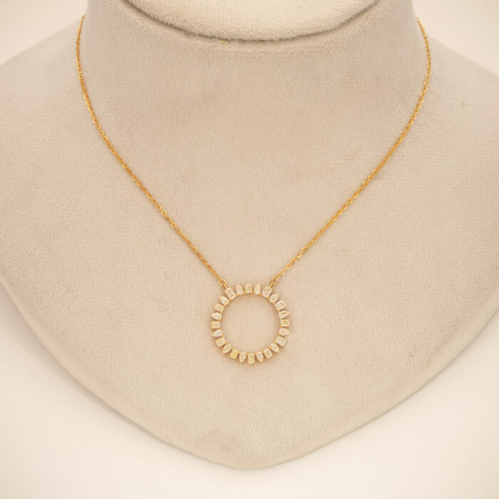 A refined 18KT Yellow Gold pendant necklace featuring a circular sunburst motif adorned with shimmering pear- emerald natural diamonds, symbolizing eternal elegance.