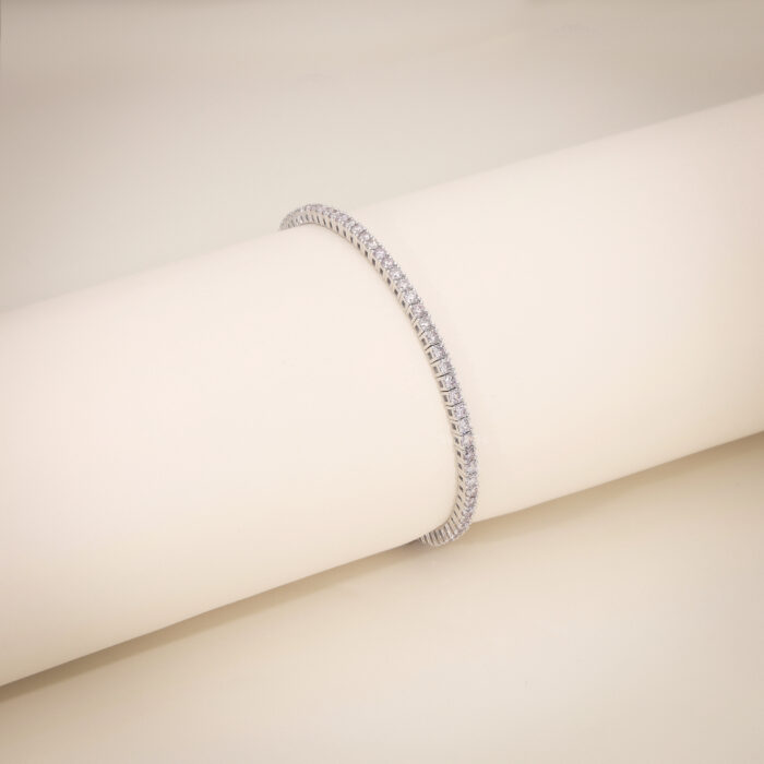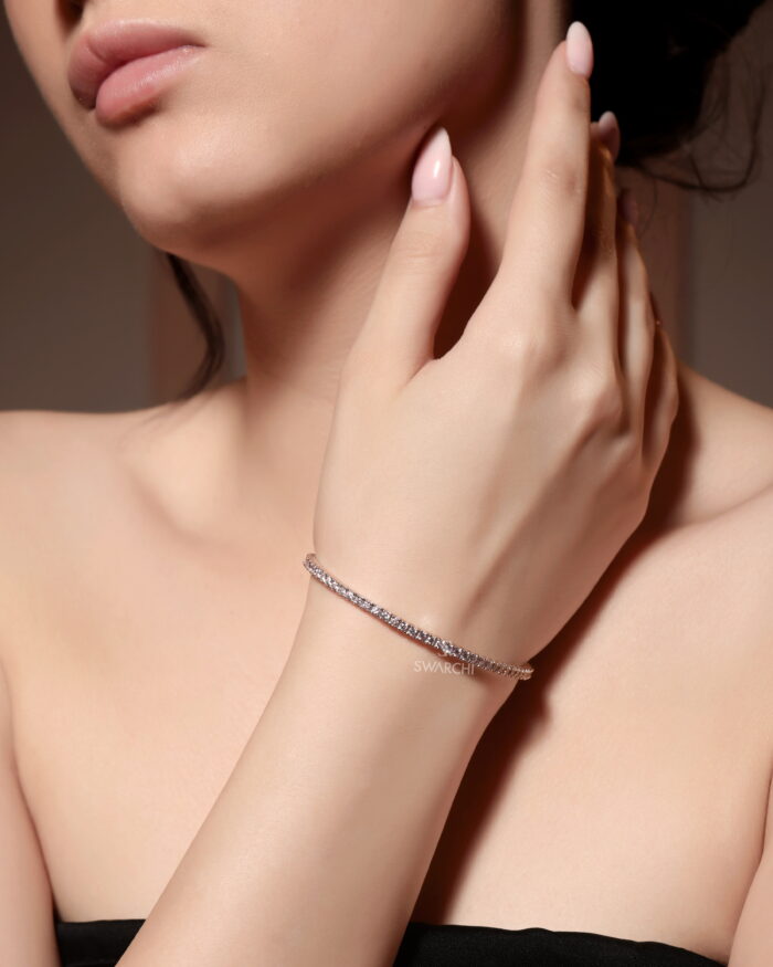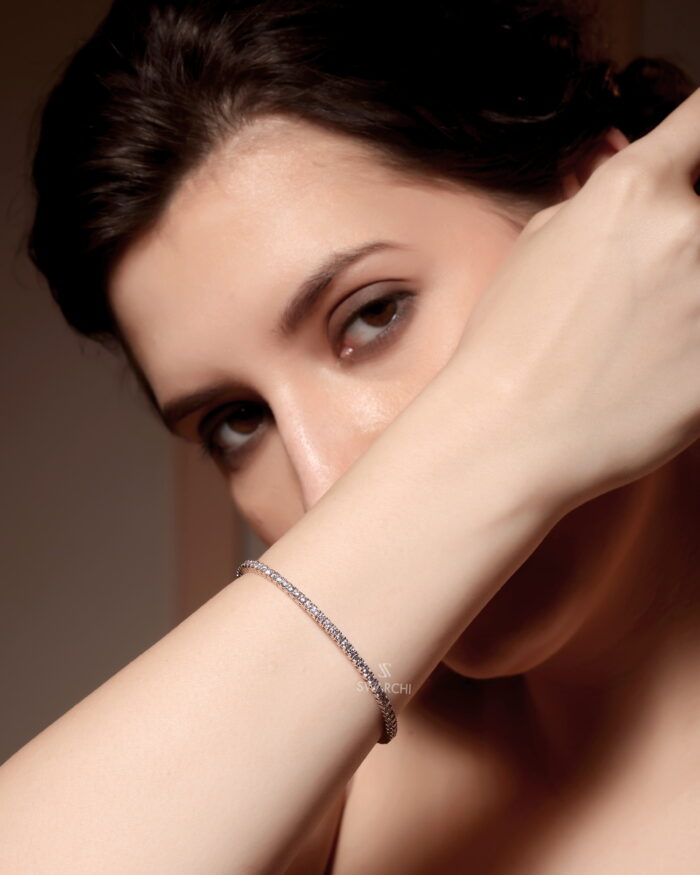 Each diamond is meticulously set to form a flowing circle of brilliance, capturing both warmth and clarity in perfect symmetry. With a sleek silhouette and precision detailing, the bracelet wraps gracefully around the wrist and secures with an invisible clasp.