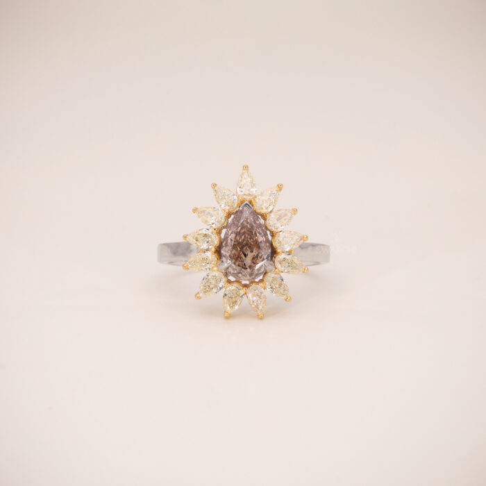 A luxurious 18KT White Gold ring showcasing a pear-shaped Natural Fancy Brown Diamond, gracefully surrounded by a sunburst halo of Pear diamonds.