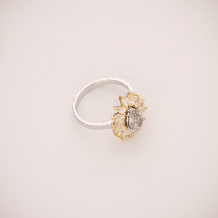 The center diamond is securely set in a refined yellow gold prong setting, enhancing its rich champagne-brown tones. Encircling the centerpiece is a radiant sun-inspired halo of meticulously arranged pear natural diamonds, creating a floral burst of brilliance and depth.