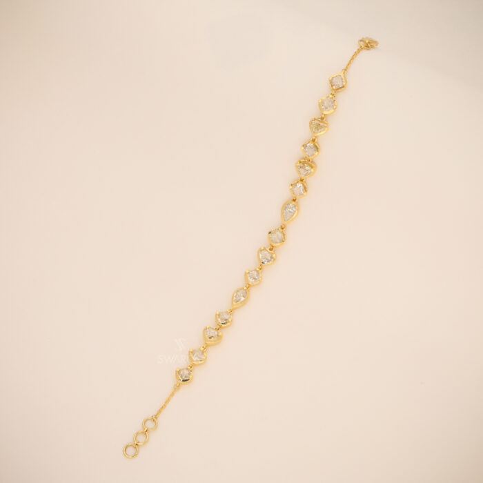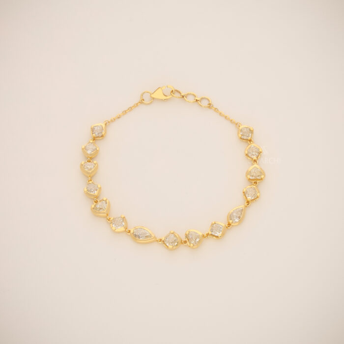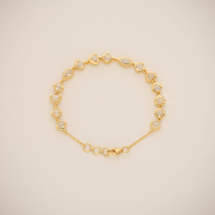 The design features a rhythmic strand of Mixed-Cut Diamonds, including Pear and Marquise shapes. By encasing each diamond in a solid gold border, the bracelet gains a more substantial, luxury feel while protecting the stones for daily wear. The yellow gold bezels amplify the size of the diamonds and provide a warm, glowing contrast to the icy white brilliance of the gems.