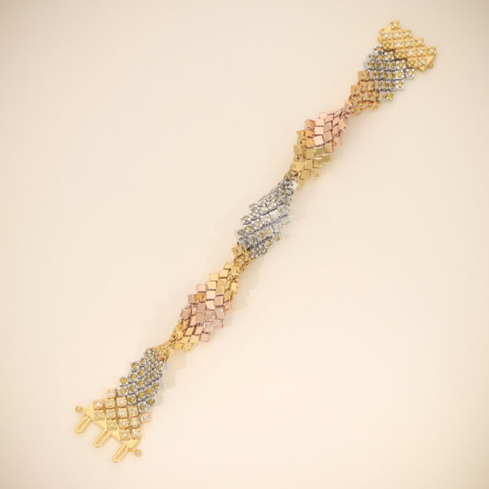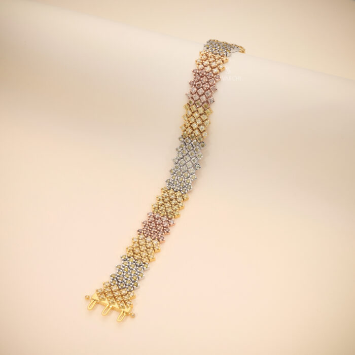 The Versailles Bracelet is a celebration of regal sophistication and masterful craftsmanship. Expertly fashioned in 14K Yellow, Rose, and White Gold, its intricate lattice design is encrusted with a hand-selected spectrum of fancy color diamonds. The diamonds transition seamlessly from golden warmth to champagne brilliance, soft rosy blush, and cool icy tones, creating a mesmerizing play of color and light.