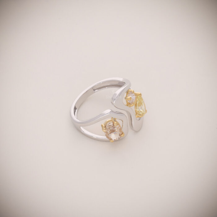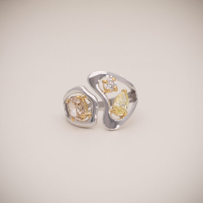 A contemporary 18KT White Gold open-curve ring accented with 18KT Yellow Gold prongs, featuring a striking trio of Natural Fancy Diamonds. The sculptural wave design highlights contrast, brilliance, and modern luxury.